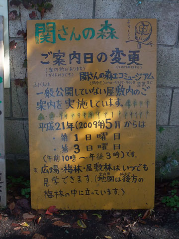 一方、松戸市の都市計画道路3・3・7号が関さん宅の屋敷林や庭を横切る計画であったため、反対運動が起きました。そして全国から署名も集まり、都市計画道路ではなく暫定道路として迂回道路を設けることで合意にいたることになりました。都市計画道路3・3・7号について書かれた松戸市のWebサイトへのリンクを下記に紹介します。そこに示された覚書より、道路に面する「むつみ梅林」は2010年3月が見納めのようです。(Webサイトの構成、筆致からお上の意地のようなものが読み取れます。)