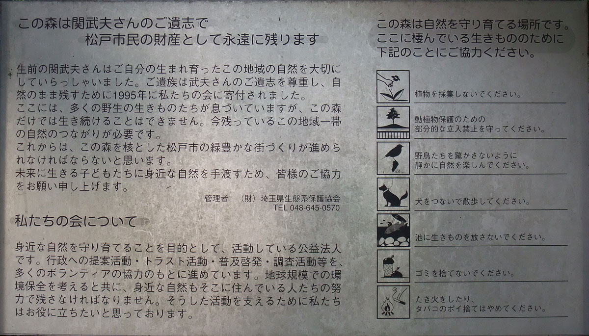 新松戸から北小金へ向かう道路のT字路の近くに「関さんの森」があります。故人である関武夫さんが森を自然のままに残すために(財)埼玉県生態系保護協会に1995年に寄付をされたもので地域の大切な森となっています。